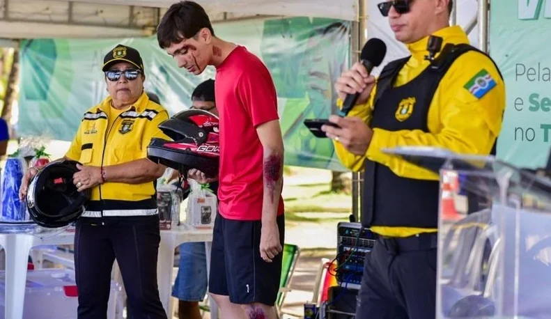 Durante a atividade, foi promovida uma simulação de sinistro de trânsito envolvendo motociclistas, além de orientações sobre o uso correto do capacete, item essencial para a proteção e redução de lesões em ocorrências. A ação buscou alertar condutores e pedestres sobre atitudes responsáveis que podem salvar vidas.